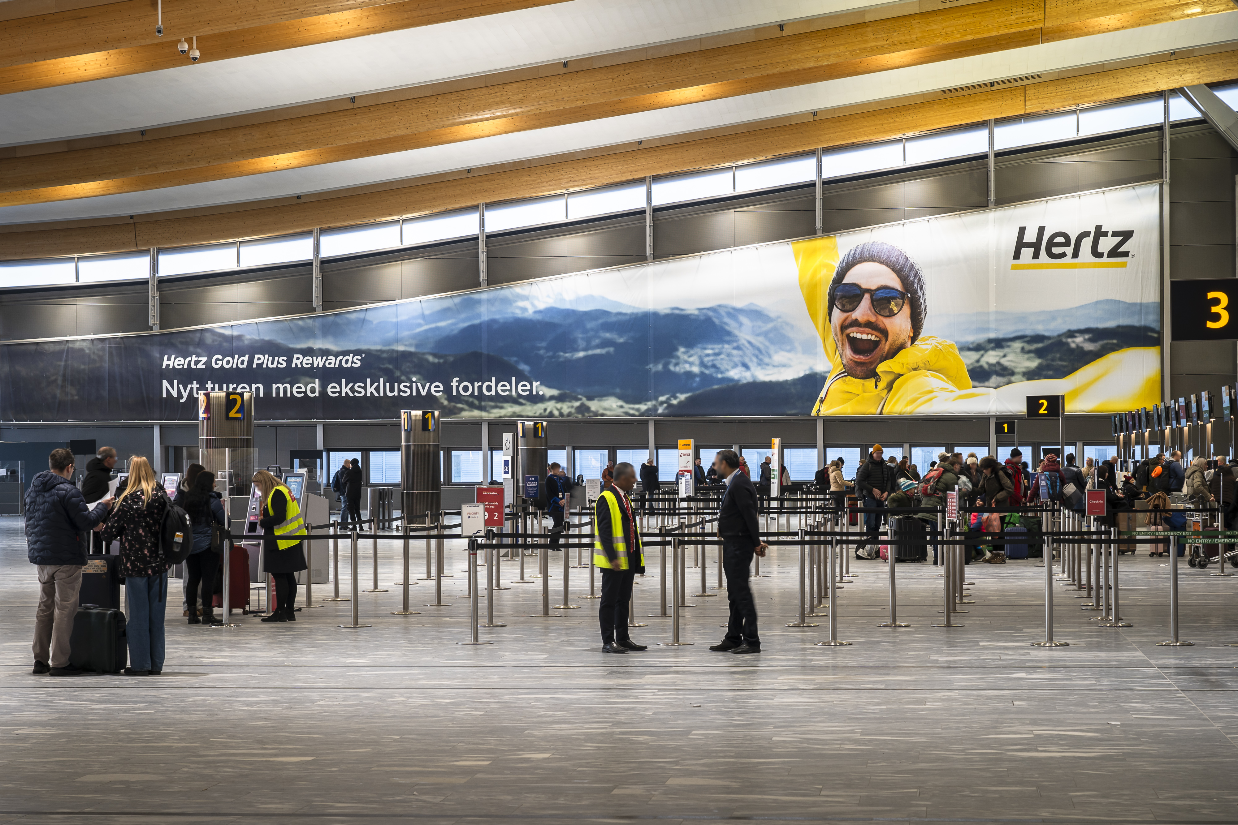 On the western wall of the check-in area at Oslo Airport you will find our banner. With its special shape and enormous size, it catches the attention of travellers moving through the check-in area and security. All travellers enter here, making the traffic flow in this area among the highest in the entire airport.