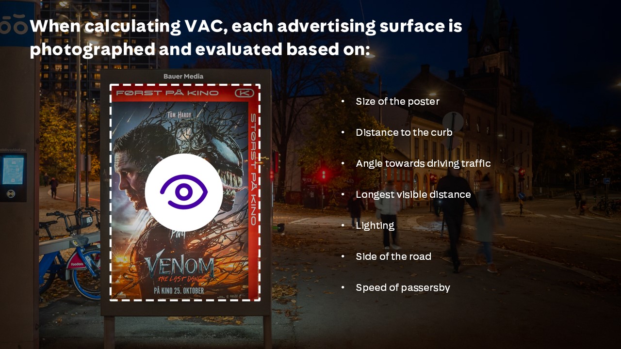 VAC stands for Visibility Adjusted Contacts, which means that the coverage figures are adjusted for probable eye contact. We know that only a proportion of the people who pass an advert actually see it, and we believe that these are the only people who should form the basis of the medium's pricing. Thus, our currency is based on people who have actually seen the advert, rather than the people who could have seen the advert.